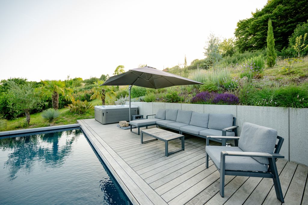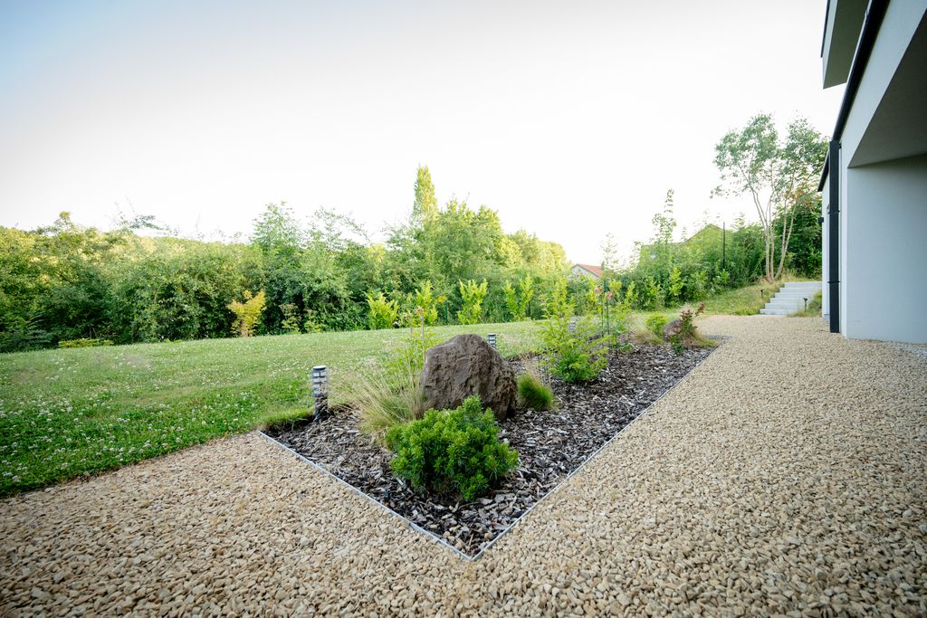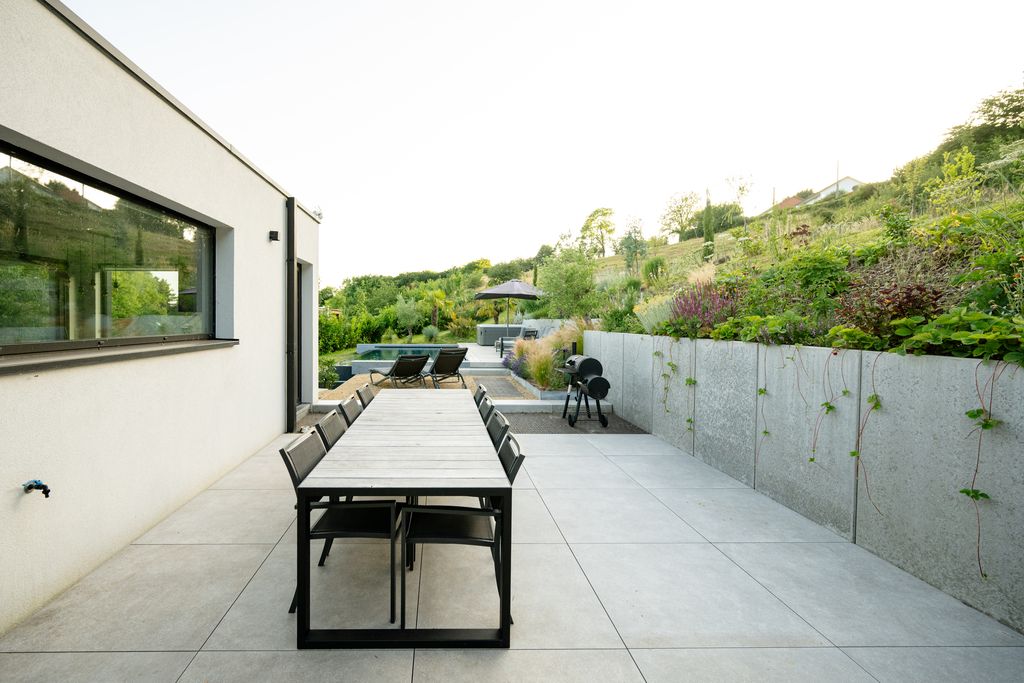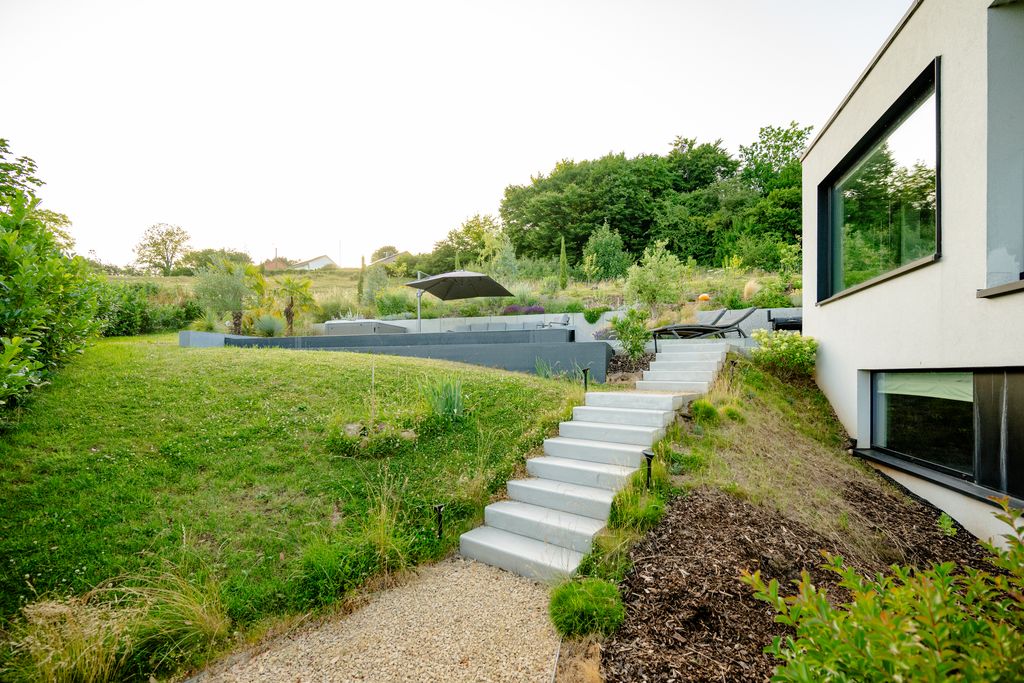 Sur un terrain fortement pentu, nos équipes ont relevé un défi de taille : créer un espace de vie extérieur harmonieux, fonctionnel et ouvert sur le paysage.