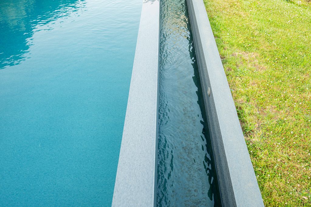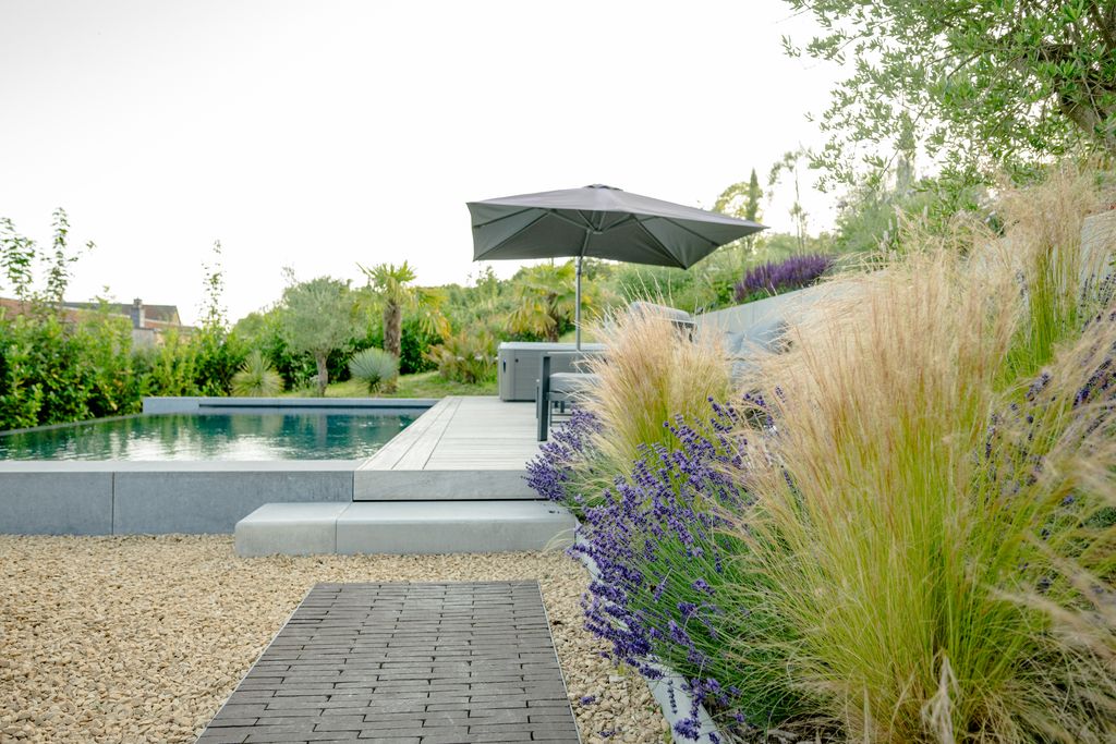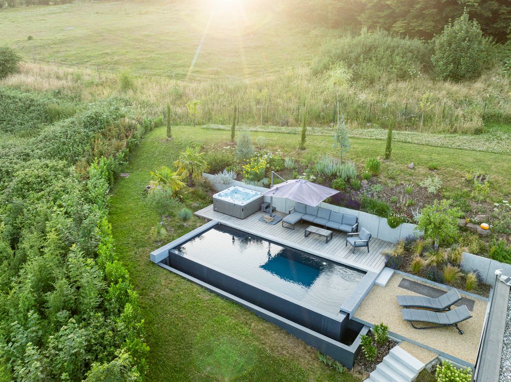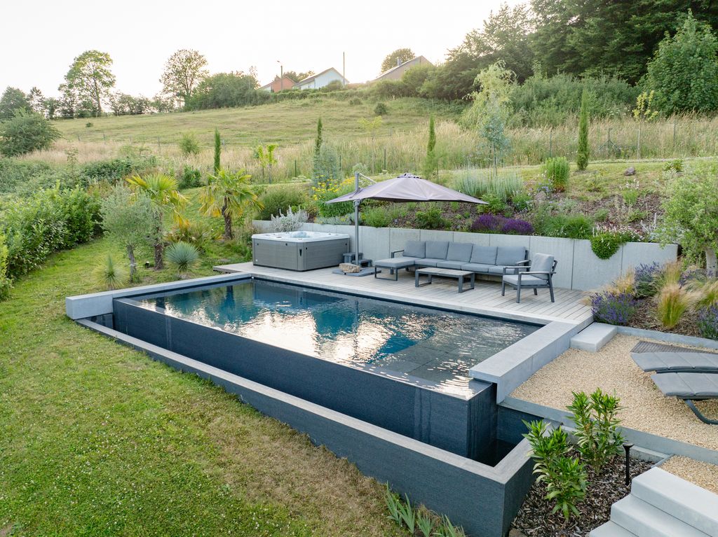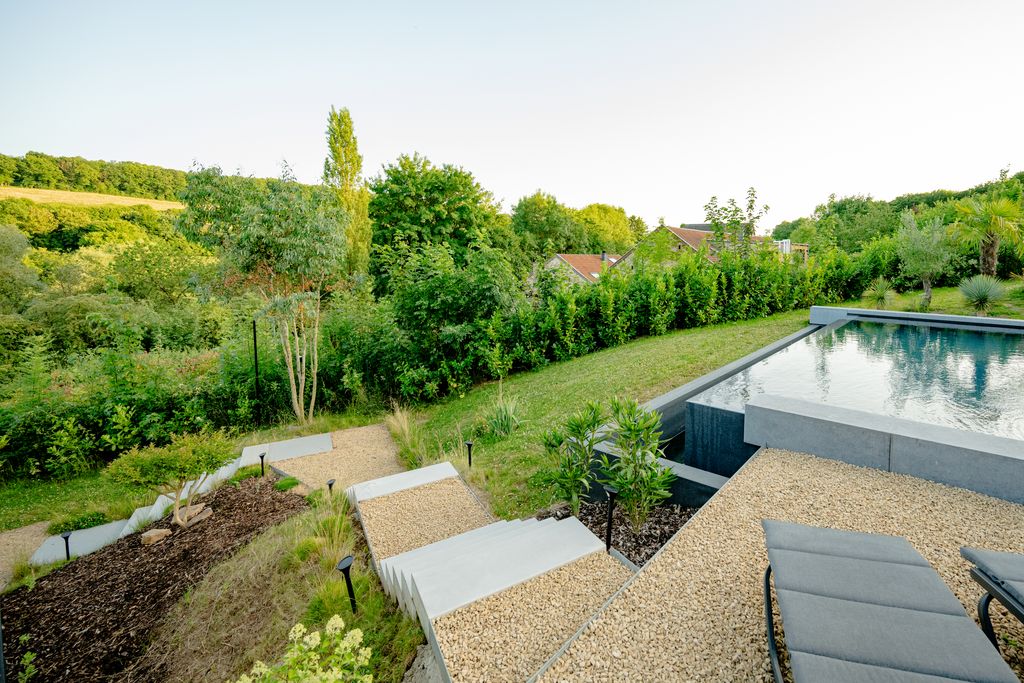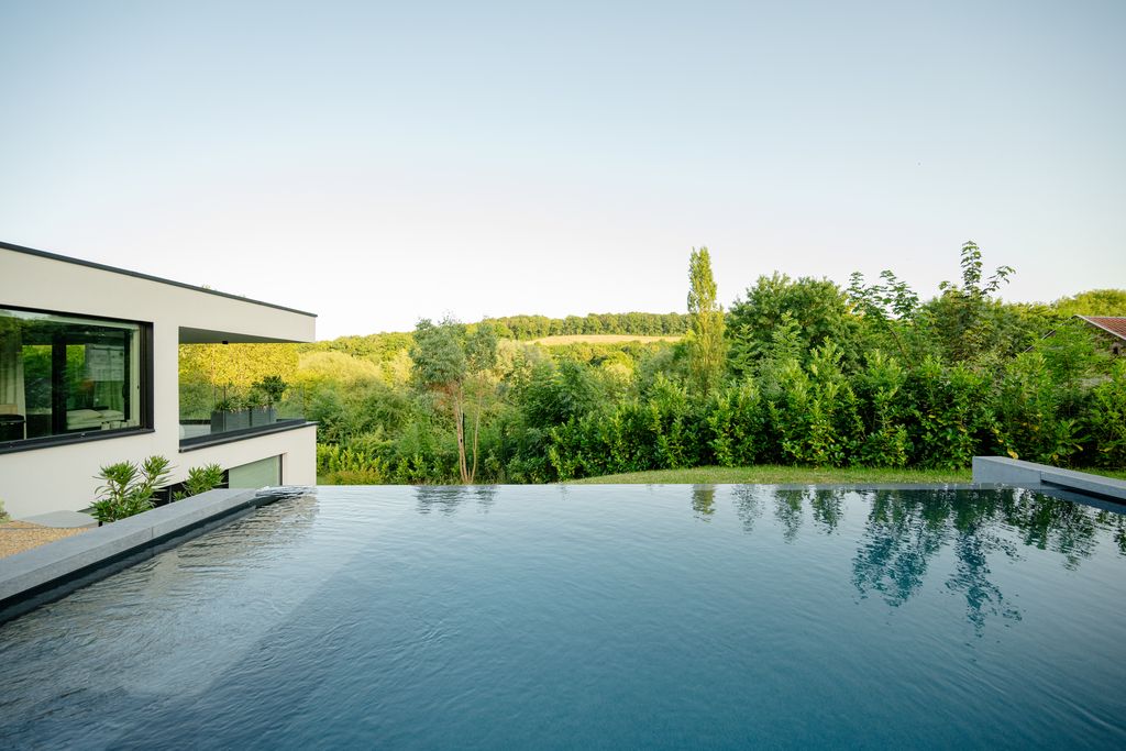 - Intégration d’une piscine à débordement, parfaitement alignée sur la perspective du paysage.