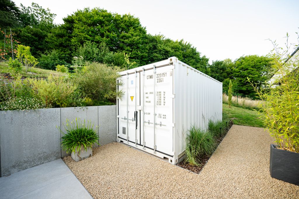 - Installation d’un container aménagé, acheminé par grue, pour accueillir le local technique de la piscine et optimiser l’espace disponible.